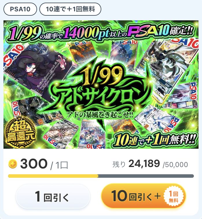 低価格帯オリパは総口数が1万口以上のものが多く、目玉カードを引き当てるのはかなりの運と金額が必要になります。