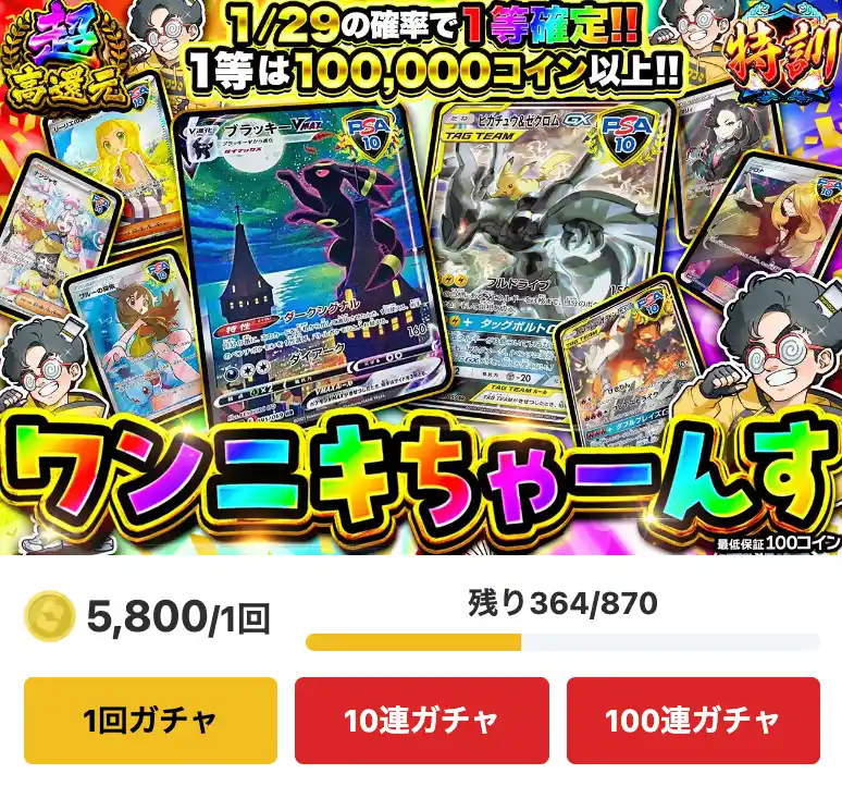 一般的に高額オリパはリスクが高いと思われがちですが、オリパワンは当たりやすさとラインナップのバランスが優秀です。安心してワンチャンを狙う楽しさを味わえるおすすめのオリパサービスと言えますね。